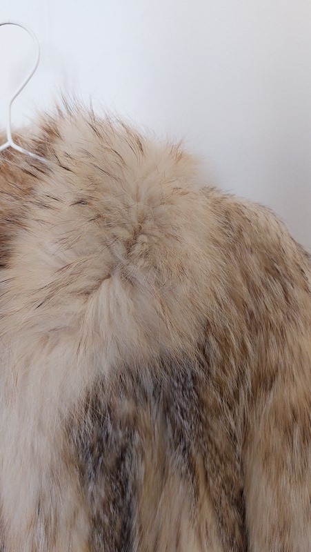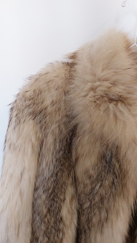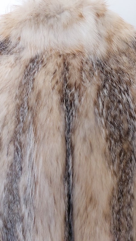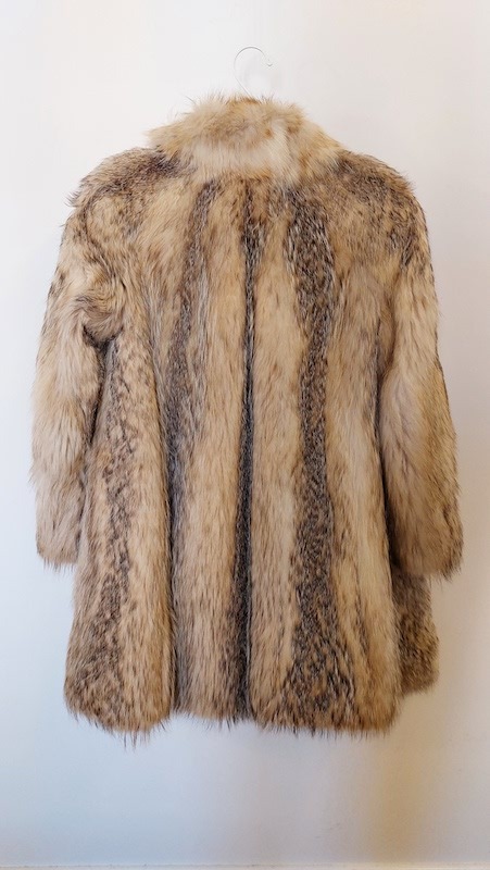 Elegante abrigo de pelo corto con un diseño de rayas verticales en tonos beige y marrón. Su forro interior es de un suave tejido satinado.